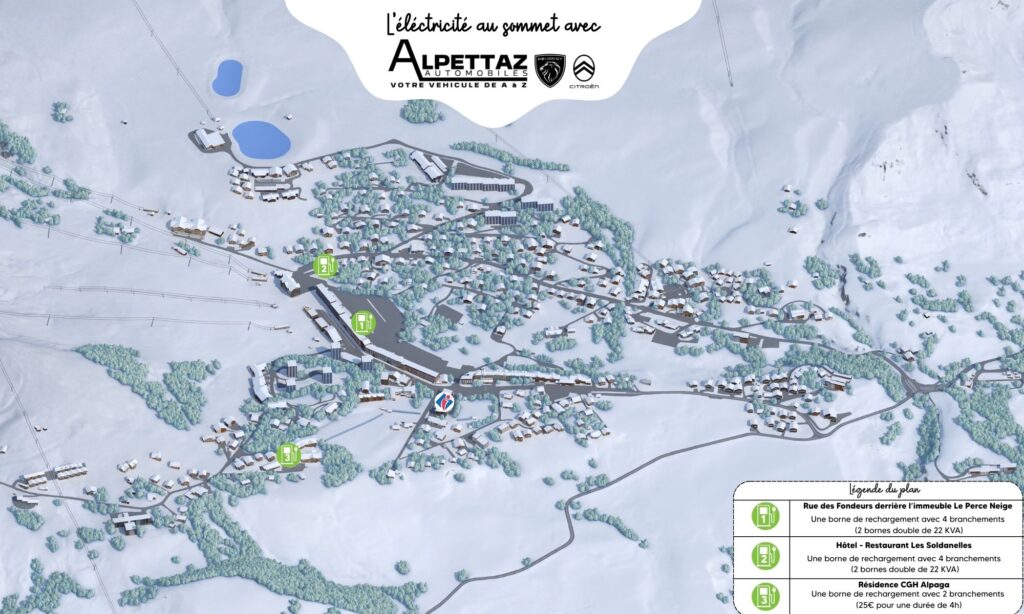 – Street of Fondeurs behind the Le Perce Neige building. You’ll find a recharging point with 4 connections (2 double 22 KVA points). To connect, you’ll need your application.