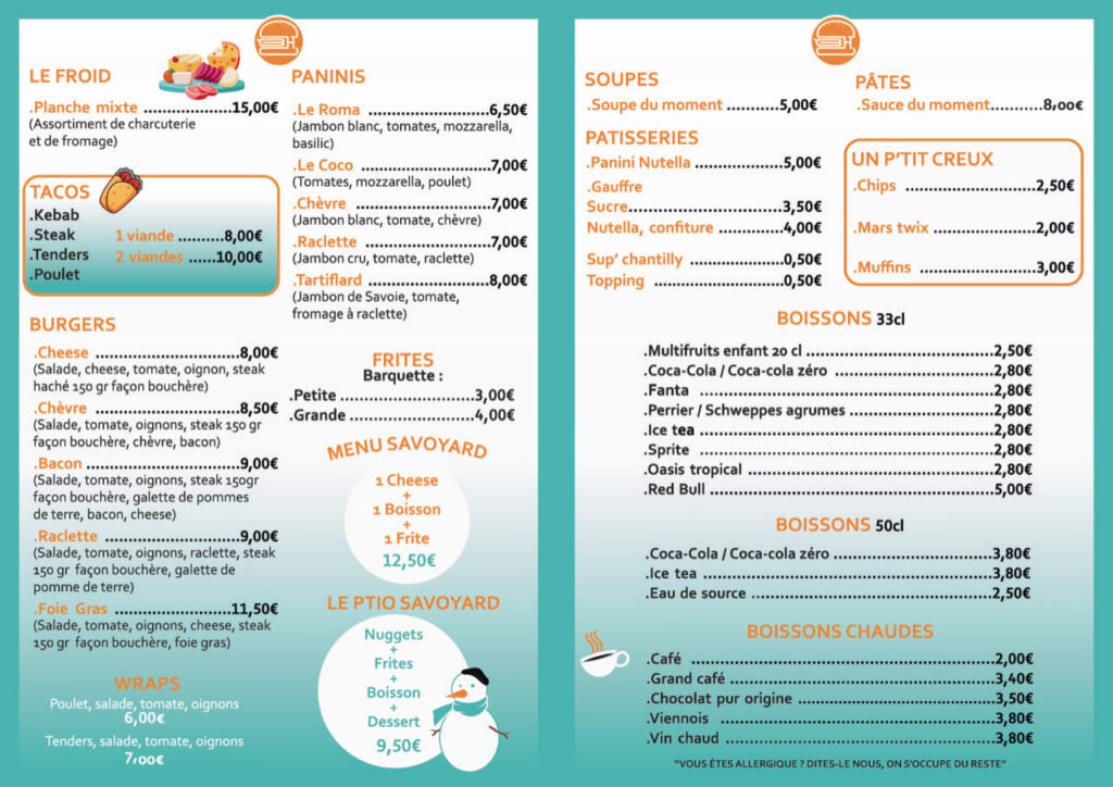 Tussen brasserie en typische Savoyaardse gerechten Geniet 's middags van hun brasseriekaart. 's Avonds kunt u zich tegoed doen aan hun Savoyaardse kaart.