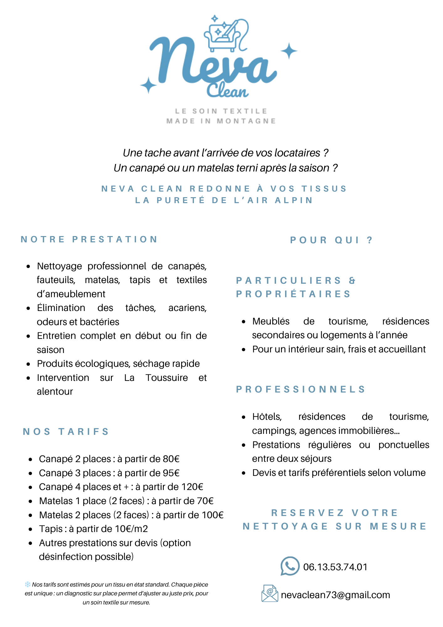 Neva Clean intervient à domicile sur La Toussuire et alentours pour le nettoyage professionnel de textiles d’ameublement : canapés, tapis, matelas, chaises, banquettes, moquettes...