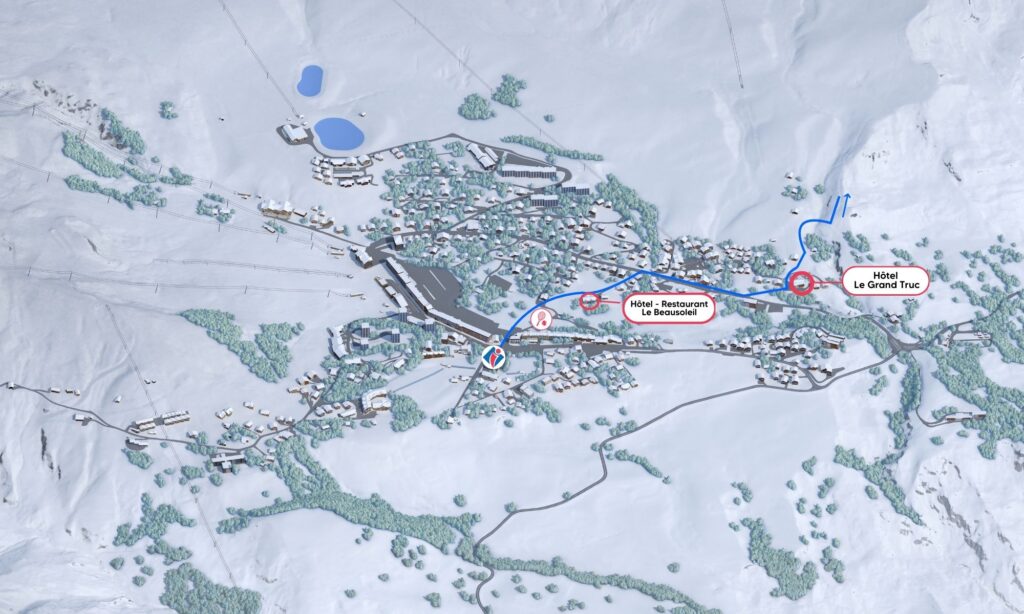 Het startpunt bevindt zich boven het hotel Grand Truc. Om daar te komen, steekt u vanaf het VVV-kantoor het centrum van het resort over, langs de tennisbaan en het restaurant Le Beausoleil, om aan de rechteroever uit te komen: rue des Chasseurs Alpins. Daal langs de rechteroever af om bij de impasse Sylvain Truchet uit te komen.