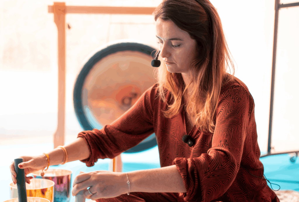 Anaïs neemt u mee op een geluidsreis van een uur op het ritme van kristallen klankschalen, trommels, gongs en andere instrumenten.